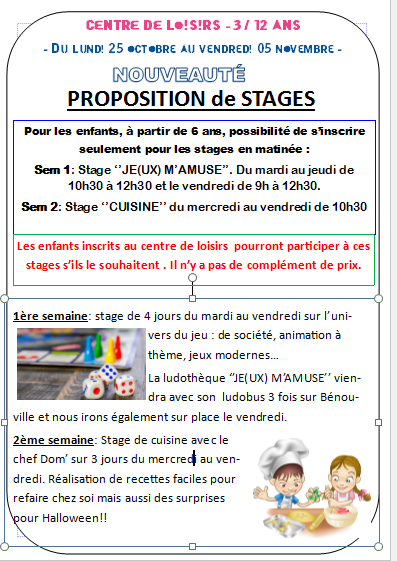 Lieu : au centre de loisirs (locaux du réfectoire scolaire 1 rue du Grand Clos )
