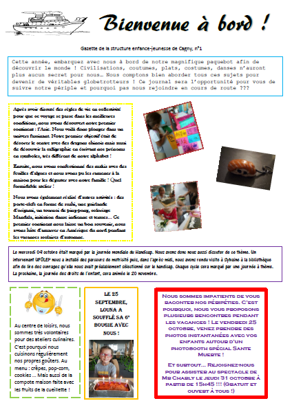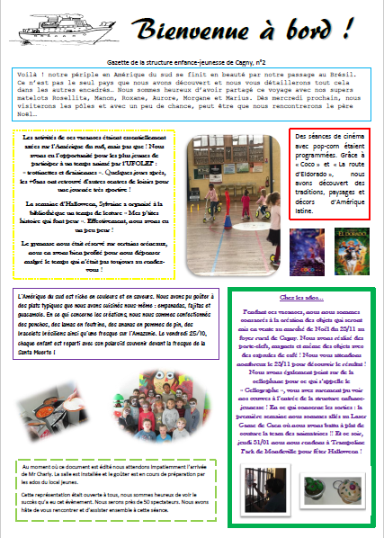 Depuis la rentrée de septembre 2019, la structure enfance-jeunesse de Cagny possède sa propre gazette. Vous y retrouverez les nouvelles du centre de loisirs et du local jeunes à la fin de chaque cycle et de chaque période de vacances scolaires.
