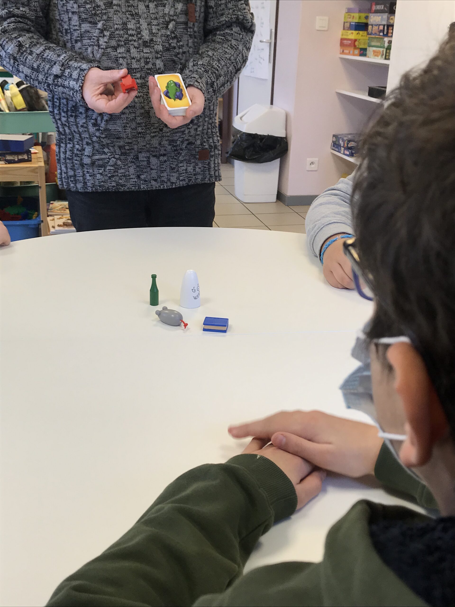 « BAZAR BIZARRE »… C’est une nouvelle acquisition parmi les nombreux jeux qui constituent cet atelier. Un jeu petit format au drôle de nom ! Aujourd’hui, les enfants sont rassemblés autour d’une table pour partager un jeu de société, accompagné par leur éducateur, David.