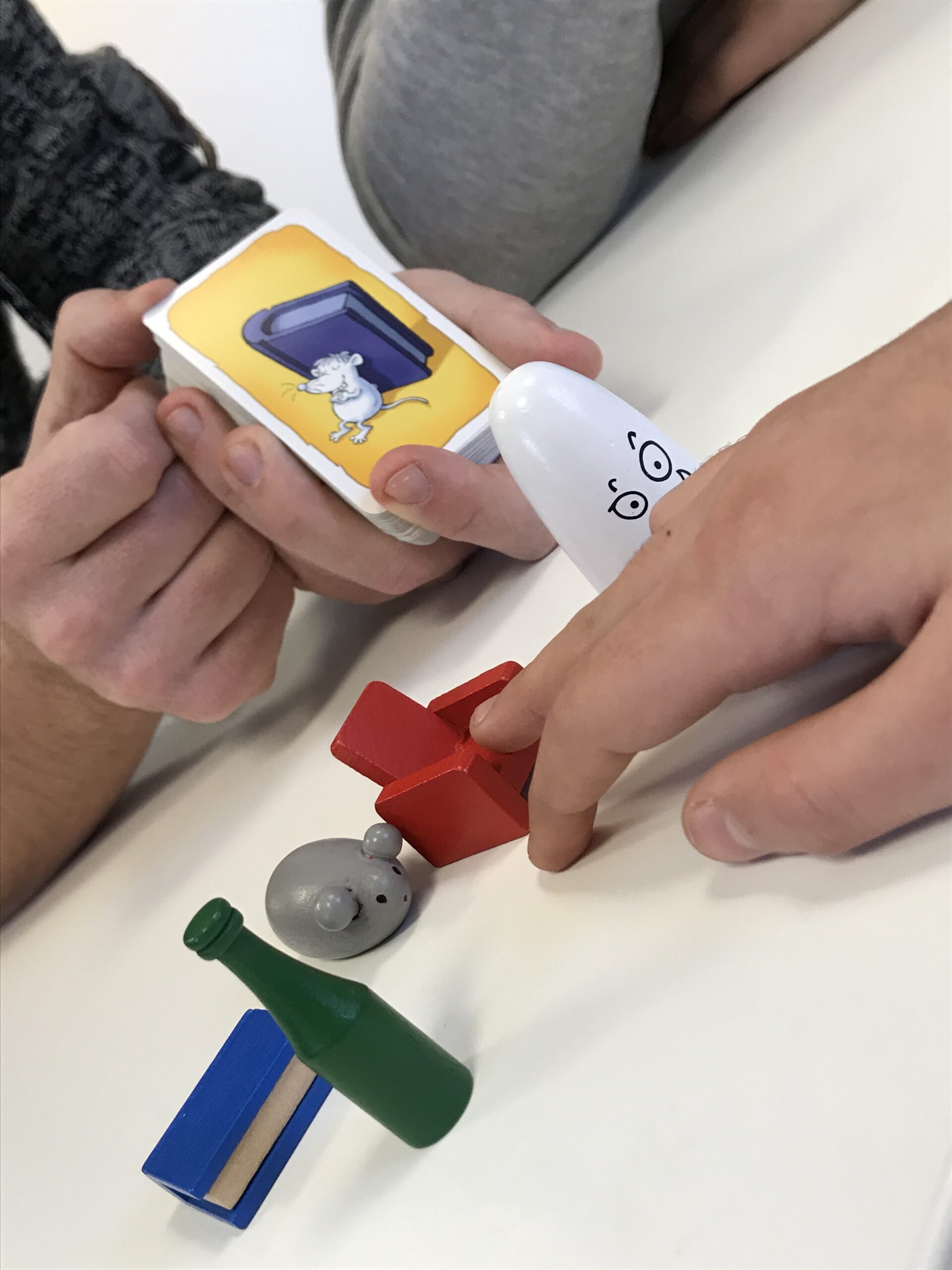 Lucie : « On a 5 objets : une souris grise, un fauteuil rouge, un fantôme blanc, une bouteille verte, un livre bleu , on doit observer les cartes que David nous montre et chercher sur la carte ce qui manque comme couleur ou comme objet ».